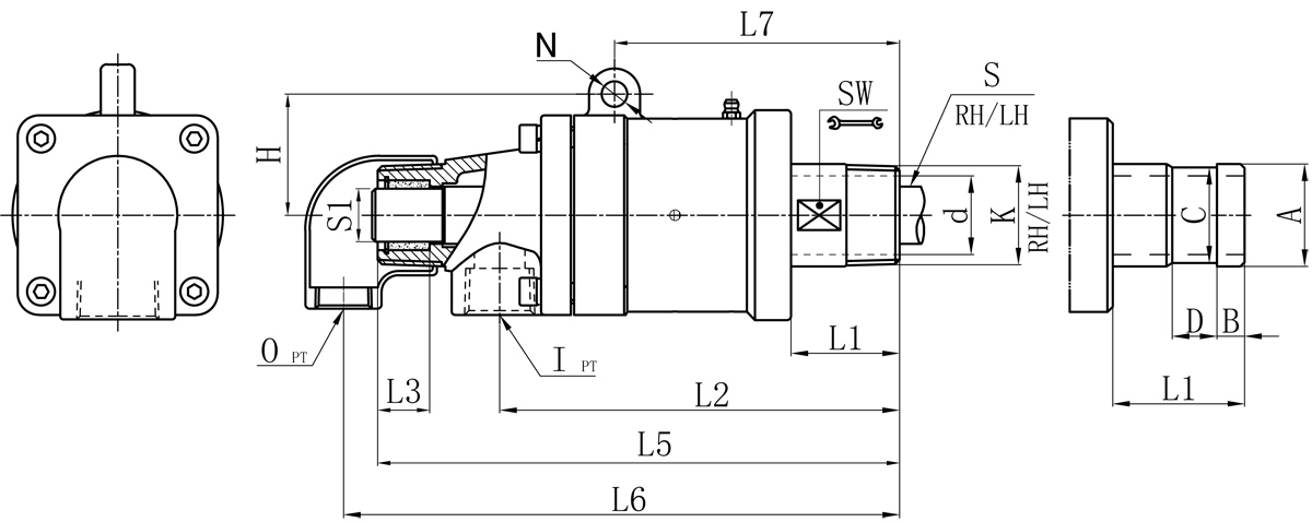 Model | K | I | O | S1 | d | L1 | L2 | L3 | L5 | L6 | L7 | N | H | SW | 法蘭式外管尺寸對照表 | |||