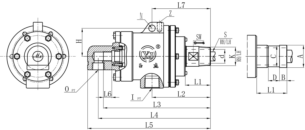 Model | K | I | O | S | d | L1 | L2 | L3 | L4 | L5 | L6 | L7 | Z | N | SW | H | 法蘭式外管尺寸對照表 | |||