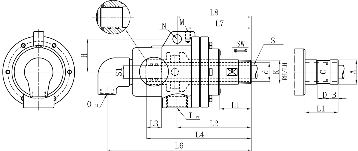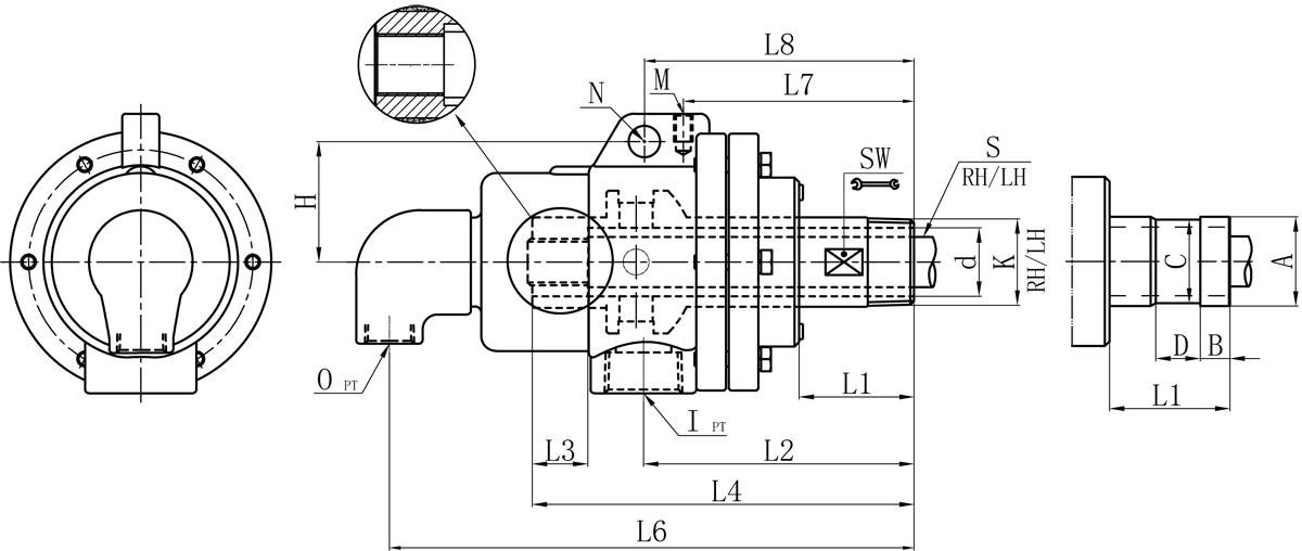Model | K | I | O | S1 | d | L1 | L2 | L3 | L4 | L6 | L7 | L8 | M | N | H | SW | 法蘭式外管尺寸對(duì)照表 | |||
