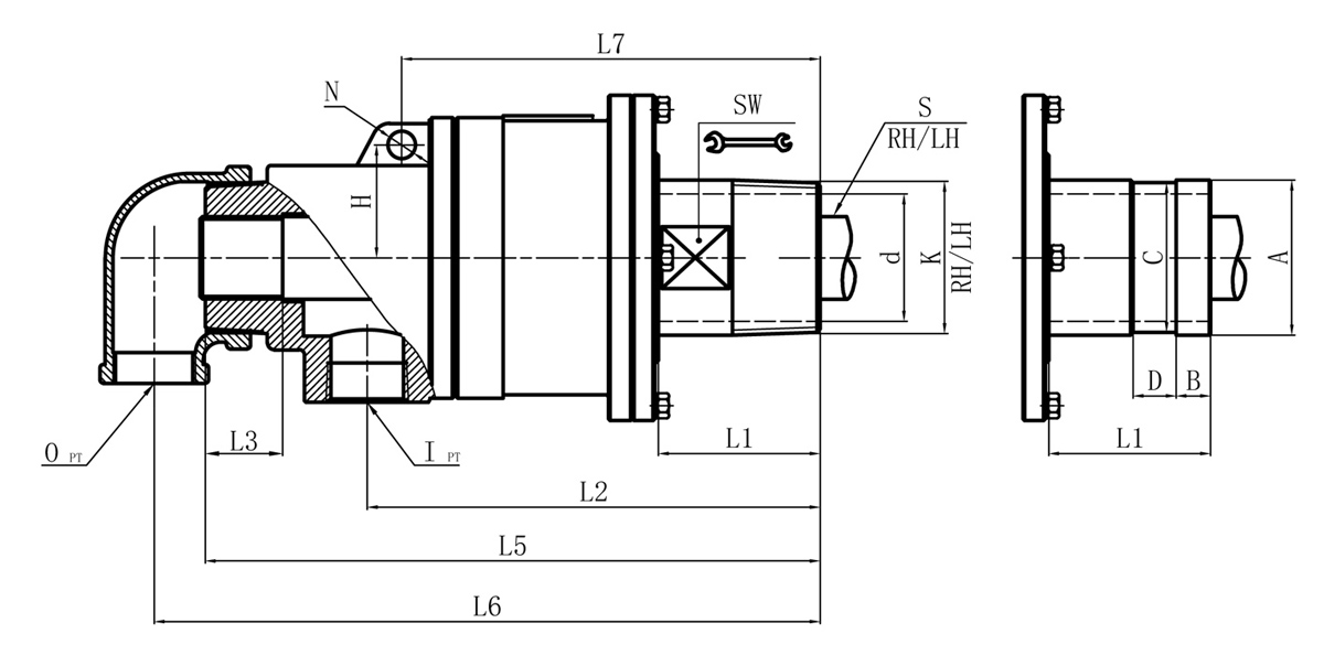Model | K | M | I | O | S | S1 | D1 | L1 | L2 | L3 | L5 | L6 | L7 | L8 | N | SW | H | 法蘭式外管尺寸對(duì)照表 | |||